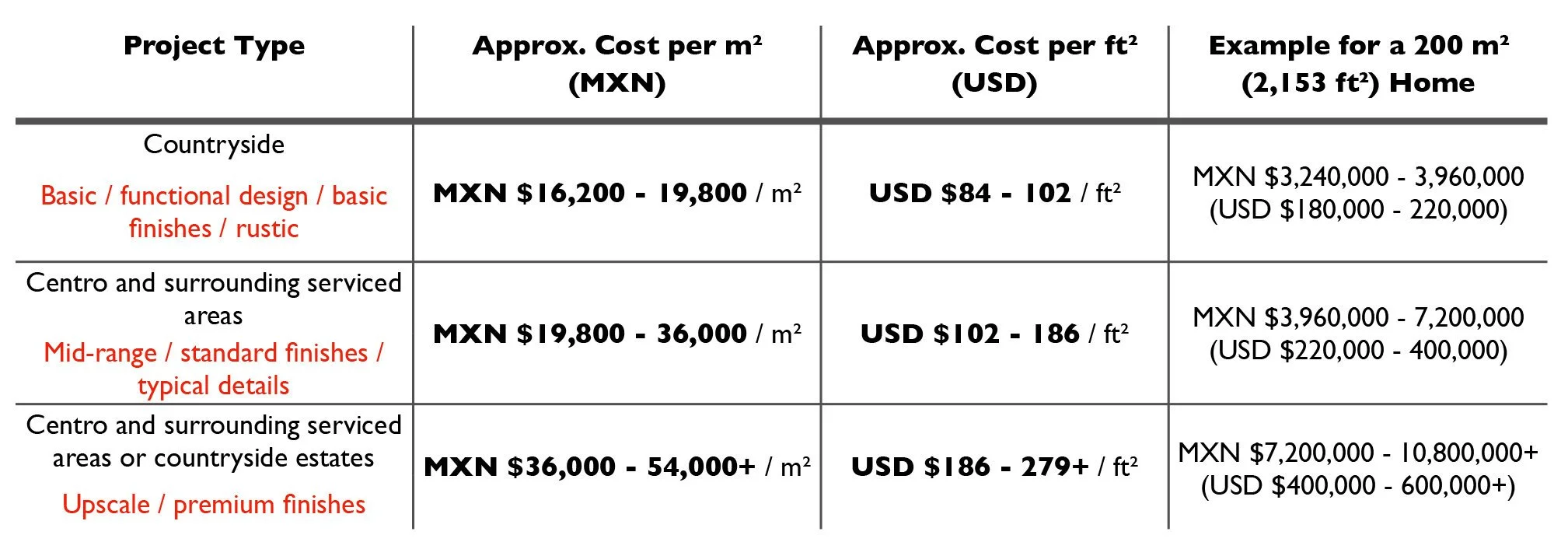 * These ranges represent construction cost only and do not include associated costs (e.g. property acquisition, utilities, furnishings, landscaping, design, engineering, and permits). Actual costs vary depending on site conditions, materials, and the level of customization - as well as the current market demands and exchange rates. For this table, the exchange rate used was 1 USD ≈ 18 MXN.