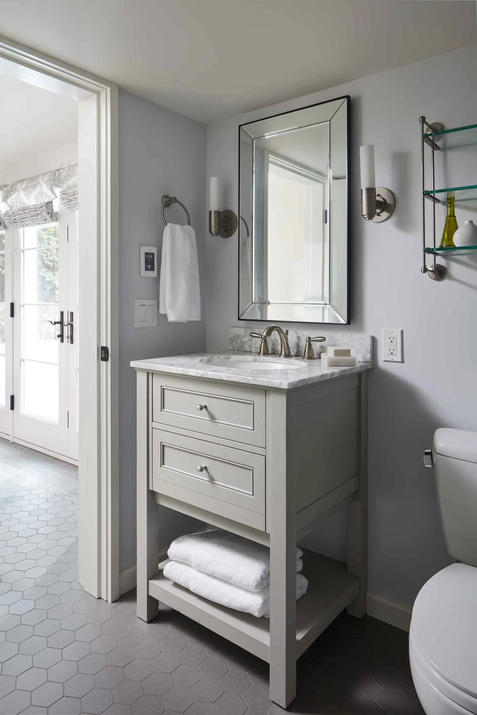 Remodel of a classic 1918 bungalow for accessibility including wider hallways and doors and a bathroom designed for caretaker-assisted bathing